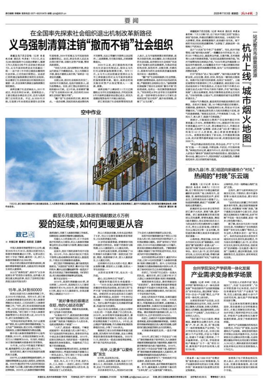 A feature titled “Taizhou University Deepens Integration of Industry, Education, Research, and Application: Turning Industrial Needs into Teaching Scenarios” was published on its “Top News” section by Zhejiang Daily on July 3.The rep...