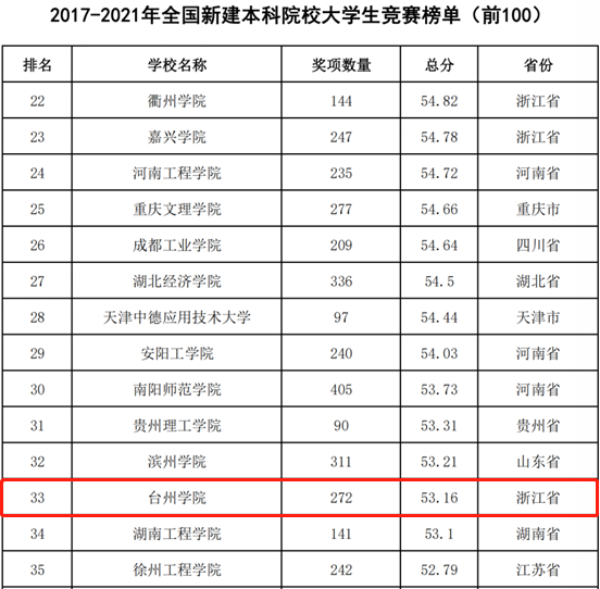 This year, Taizhou University ranked 33rd with 272 awards and 53.16 total scores in the 2017-2021 national undergraduate competition of newly-built colleges, 48 places higher than the previous round of rolling list. It also ranked 298th in the 2017-2021 National College Students Competition Ranking and entered the top 300 for the first time.