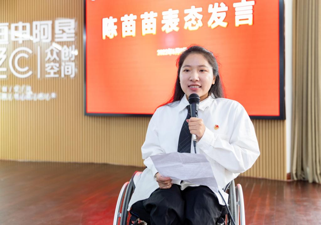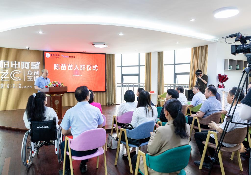 On the morning of June 8, Chen Miaomiao's induction ceremony was held in Zhejiang Hengshen Technology Co., Ltd. Jin Xianlong, Vice Secretary of the CPC Committee of Taizhou University, attended the ceremony and delivered a speech. Lyu Hangbin, director of labor and employment service center of Taizhou Disabled Persons' Federation, presided over the ceremony. Leaders of Taizhou Municipal CYL Committee, Human Resources and Social Security Bureau, Taxation Bureau, Jiaojiang District CYL Committee, Women's Federation, CPPCC, and relevant departments of TU such as Student Affairs Department and School of Business attended the induction ceremony.