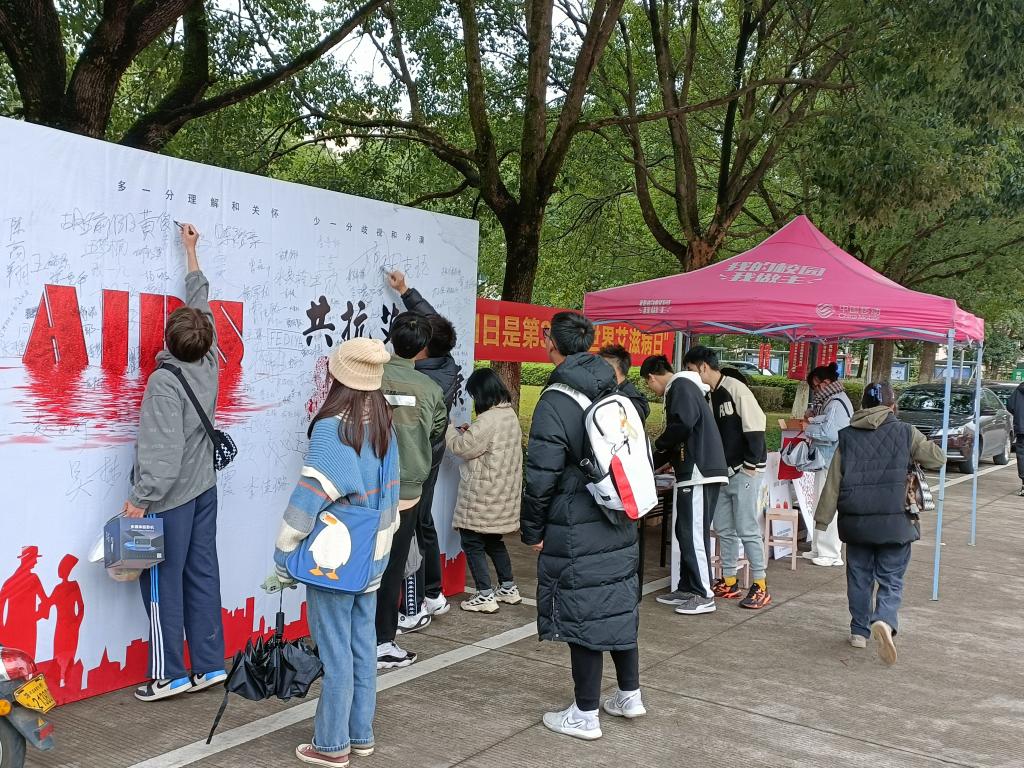 The staff and volunteers distributed publicity materials and displayed knowledge boards to publicize the knowledge of "AIDS", so that students could further understand the transmission routes of AIDS and related prevention measures, and understand the serious harm of AIDS. Students were also invited to answer questions about AIDS prevention in the form of questionnaires, so that they could actively understand AIDS in a relaxed atmosphere. In Linhai Campus, a garden party was held to guide students to know AIDS correctly so as to deepen their understanding of AIDS.