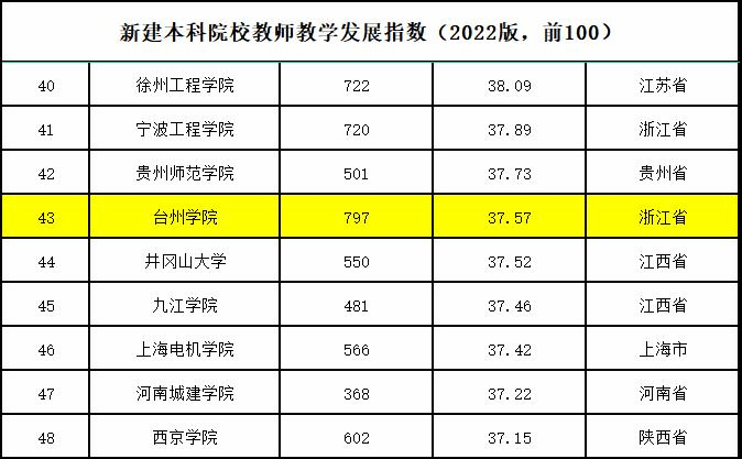 On December 23, the 2022 edition of the National College Teachers' Teaching Development Index was officially released. This is the fourth consecutive year since 2019 that the Working Group on the Research of College Teachers' Teaching Development of the Chinese Association of Higher Education has released the index. Taizhou University ranks among the top 50 in the teacher teaching development index of newly-built undergraduate universities, ranking 43rd, up 9 places from last year. The number of programs and total scores have improved significantly.