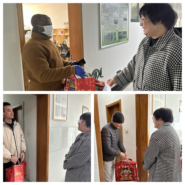 On the arrival of the Spring Festival of 2023, Li Junmin, member of the CPC Committee and vice president of Taizhou University, came to the apartment of foreign students and the office of foreign teachers to send Chinese New Year's gifts and greetings to foreign teachers and students who stayed in school during the winter vacation. Shi Anquan, head of the International College, and Wang Aiqin, deputy head of the International College, took part in this visit.