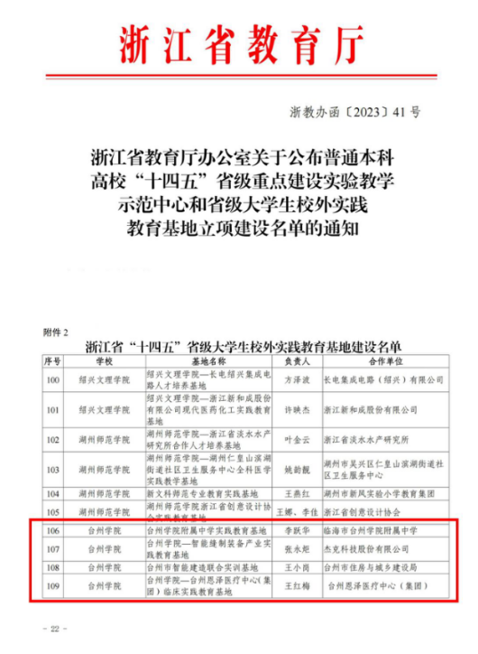 Recently, four off-campus practical education bases of Taizhou University were approved for project establishment. Up to now, our university has 7 provincial off-campus practice education bases for college students.