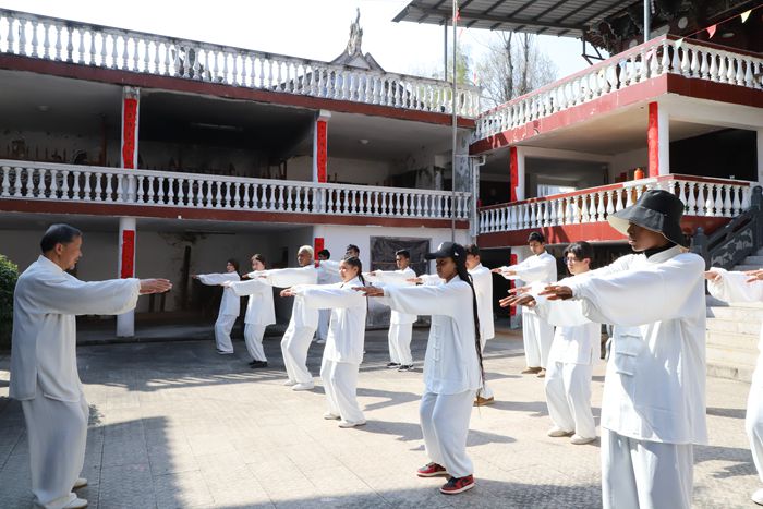 In the first stop, foreign students came to Mount Jin'ao to learn Zhaobao Taijiquan, a municipal intangible cultural heritage project. The inheritor introduced the relevant historical background of Zhaobao Taijiquan and demonstrated the boxing techniques. The overseas students showed great interest in Taijiquan, watching carefully and learning hard.