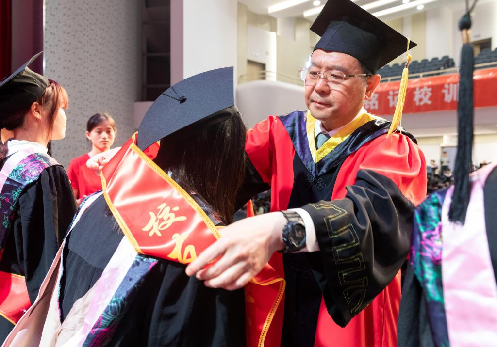 The ceremony officially commenced to the resounding national anthem. At first, Cui Fengjun, Secretary of the University CPC Committee, adorned the students who were selected as Alumni Liaison Ambassadors with sash and presented the letter of appointment to them. Then Le Chuanyong, Deputy Secretary of the University CPC Committee and University President, turned the tassel for the students, conferred degrees on them and offered them graduation gifts. Later, Zhao Xiaoming, member of the University CPC Committee and Vice University President, read out the decision on the conferment of bachelor's degrees, awarding of honors of outstanding graduates and the appointment of Alumni Liaison Ambassadors. The university leaders seated on the podium presented awards to the representatives of students who were conferred with the title of Outstanding Graduates of Zhejiang Province.