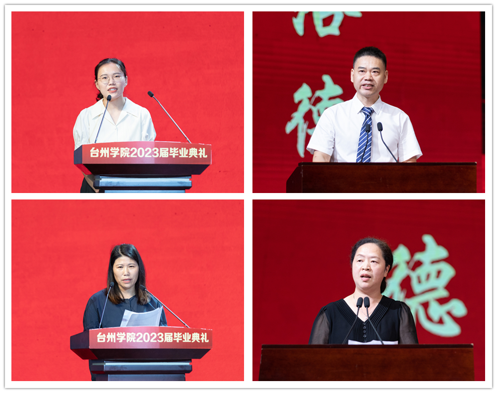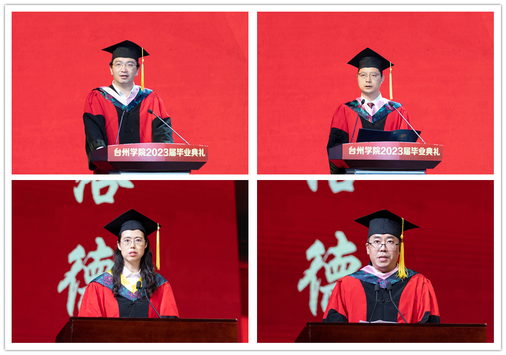 As representatives of graduates, Li Hongyu from the School of Humanities, Lu Jialing from the School of Teacher Education, Wang Zhiyue from the School of Civil Engineering and Architecture, and Yu Liwen from the School of Pharmaceutical and Chemical Engineering expressed their affection for their alma mater and vowed to take with themselves the sense of pride and responsibility that is unique to TZUers and pay back to the society with practical actions. As representatives of faculty members, Dr. Ke Lianmin from the School of Marxism, Dr. Ma Junzhou from the School of Foreign Languages, Dr. Zhang Li from the School of Intelligent Manufacturing, and Dr. Zhang Tingbo from the School of Art and Design gave speeches and encouraged students to maintain their enthusiasm for hard work and attain a fulfilling life. Representatives of distinguished alumni Chen Qiaopan and Jin Songtao, along with representatives of outstanding residence life coordinators Chen Lifeng and Wang Shunli, expressed their fond feelings and good wishes to the graduates.