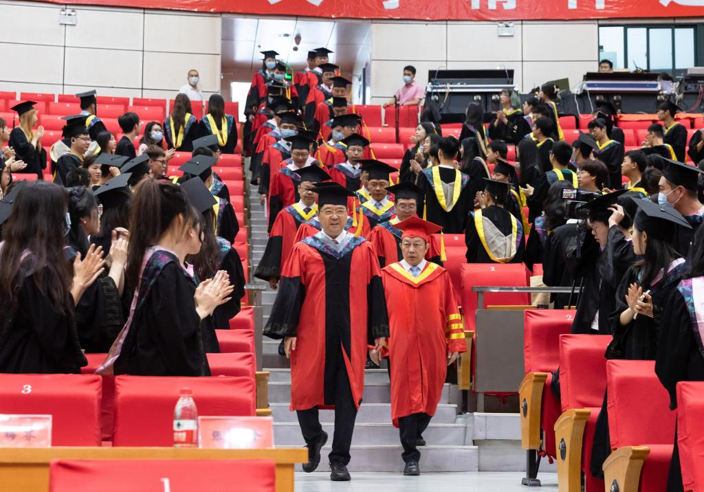 University leaders Cui Fengjun, Le Chuanyong, Zhao Xiaoming, Wang Zheng, Hu Shaoguang, Li Weiming, Yang Jianguo, and Jin Song attended the ceremony and took their seats on the podium. The ceremony was presided over by Jin Xianlong, Vice Chairman of the University’s Bachelor’s Degree Evaluation Committee and Deputy Secretary of the University CPC Committee.