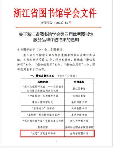Attached is the document by Zhejiang Province Society for Library Science to announce the Best Brand Award in the 4th Excellent Library Service Brand Selection, with our library’s “Jiusi” series in red frames.