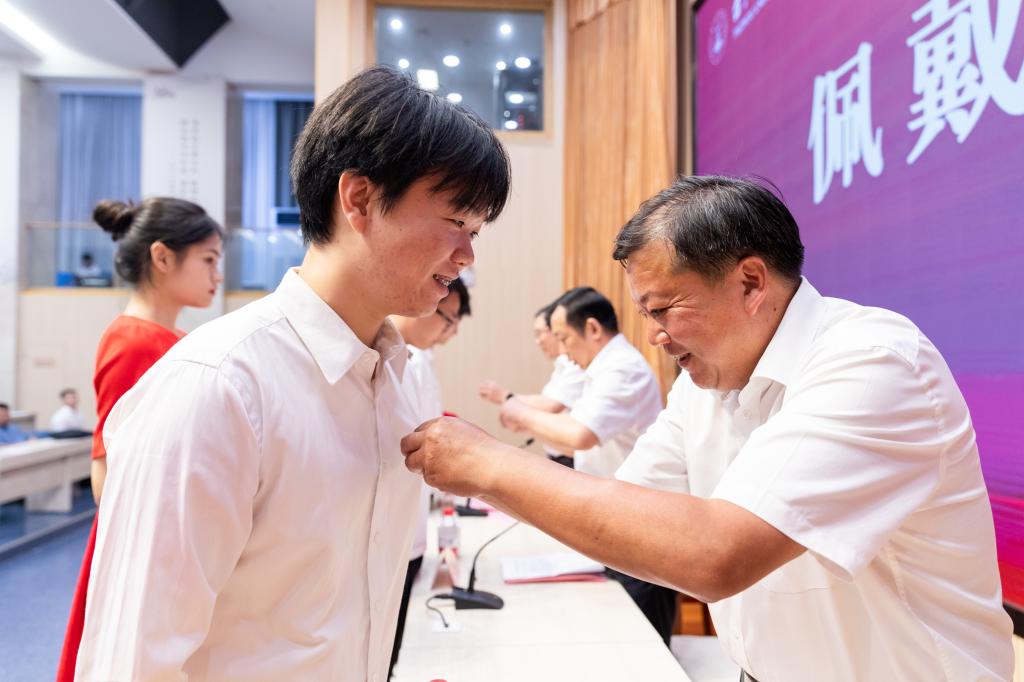 With the majestic national anthem, the opening ceremony began. In the melody of the school song “Towering Green Mountain, Lingering Lingjiang River”, the university leaders respectively pinned the university badges for the new student representatives from three degree programs. The bright and unique TU badges worn on the chest signify that 99 new students have officially joined Taizhou University, becoming a part of Taizhou University, symbolizing the students’ entry into a new journey in life, and indicating that the students will face greater challenges, shoulder heavier tasks, and undertake more glorious missions.