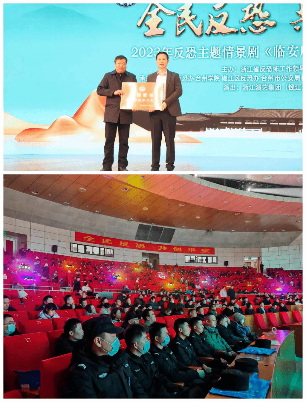 On the evening of December 19, China’s first anti-terrorism time-travel drama “Crisis in Lin’an”, co-created by Zhejiang Provincial Anti-terrorism Leading Group Office and Qianjiang Spindrift Art Troupe of Zhejiang Performing Arts Group, was put on the stage at TU. Present at the event are Liu Ying (Deputy Director of Zhejiang Anti-terrorism Office and Second Level Police Commissioner), Jin Xianlong (Deputy Secretary of the CPC Committee of Taizhou University), Liang Xuhui (Member of the Political and Law Committee of the CPC Taizhou Municipal Committee and Second Level Adminstrative Consultant), Chi Tao (Executive Deputy Director of Taizhou Anti-terrorism Office and Deputy Director of Taizhou Public Security Bureau) and Dong Shihu (Deputy Leader of Jiaojiang Anti-terrorism Leading Group, Director of Jiaojiang Anti-terrorism Office, Deputy Director of Jiaojiang District, Party Secretary and Director of Jiaojiang Public Security Bureau). More than 1000 representatives from relevant units, citizens, teachers and students also participated in the event.