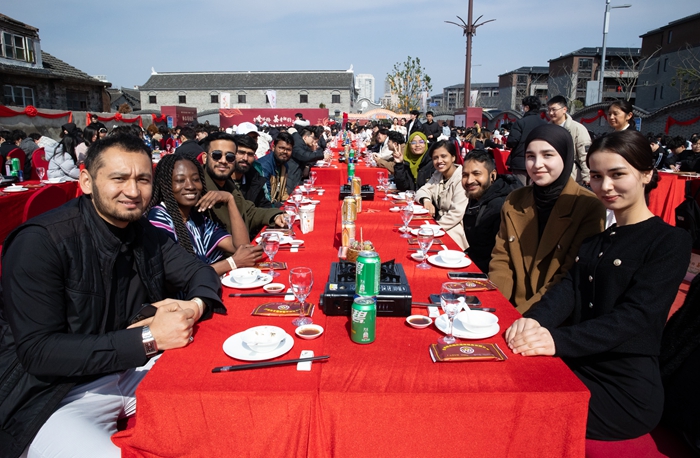 Eleven international students from Bangladesh, Uzbekistan, Cote d’Ivoire, and Pakistan studying at Taizhou University were entertained to a “1000-people Banquet” held at the “10-mile Street” in Luqiao—a district of Taizhou—on March 2nd. The banquet is a program of the Luqiao “Merry Spicy” Event themed on “Seeking Warm Luqiao, Tasting Ginger Fragrance”.