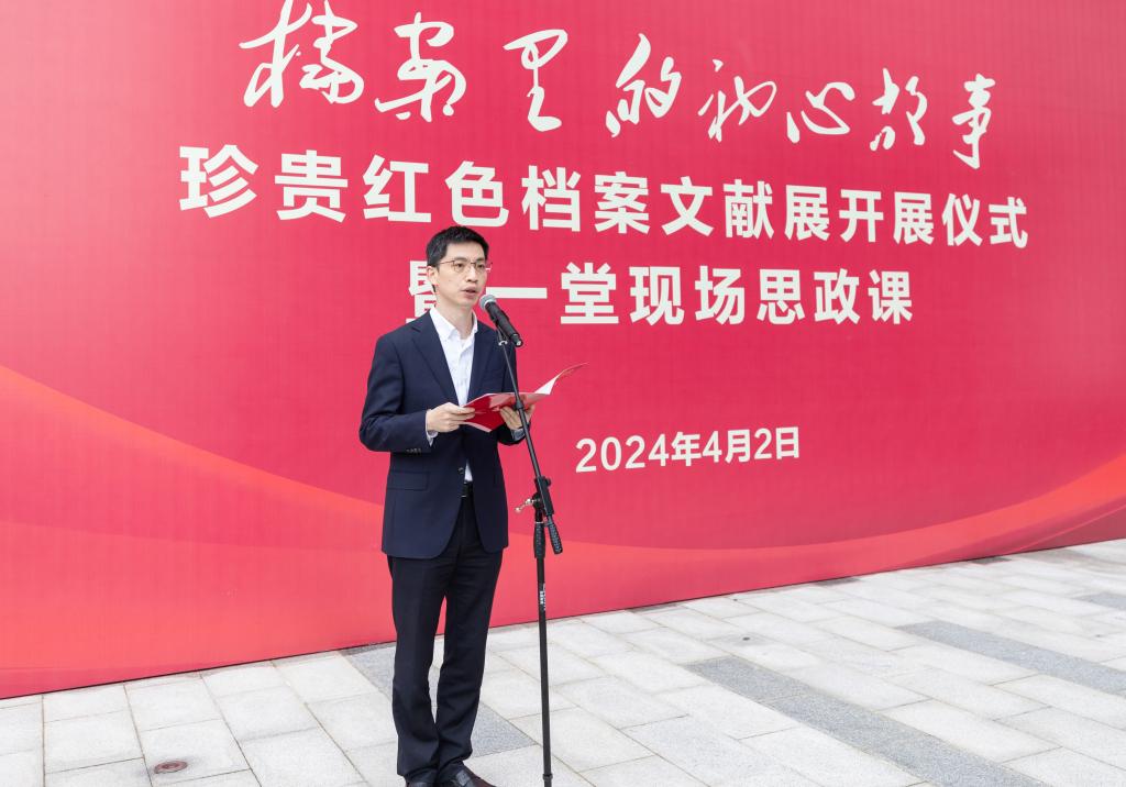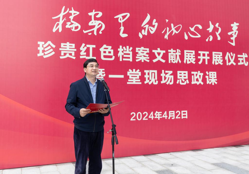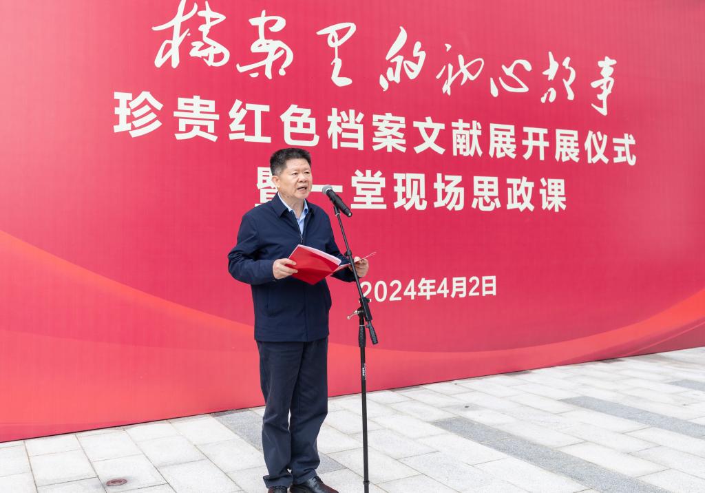 Zhu Jian delivered a speech for the event. He said that the inauguration of the exhibition hall of “Where Did We Start?—Exhibition of Rare Revolutionary Archives” is a powerful initiative to enhance the ideological leadership, educational appeal and consultative service of Party history, a way of practicing the university motto of “Develop your moral being and lead a virtuous life; Seize the time and opportunity upgrading your proficiency”, and an unremitting exploration of expanding the ideo-political education frontline. For the next stage of work, he emphasized that full play should be given to the integrated educational roles of the exhibition halls, the development of these halls into an important position for on-site teaching of ideo-political courses, and creative transformation of the revolutionary resources into those for ideo-political education. He pointed out the importance of lecturer team construction, so that they not only tell the big story of the Chinese nation, the Communist Party of China, the People’s Republic of China, and socialism with Chinese characteristics, but also tell the story of Zhejiang, the story of Taizhou, and the story of Taizhou University. Efforts should be made in strengthening the local cultural research and interpretation, the construction of scientific research platforms, attracting and introducing high-level publicity and cultural talents, supporting high-quality development with advanced cultural force, and promoting the influence of high-quality culture.