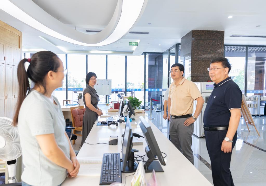 Zhu Jian visits the staff in the library of Jiaojiang Campus