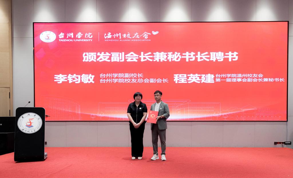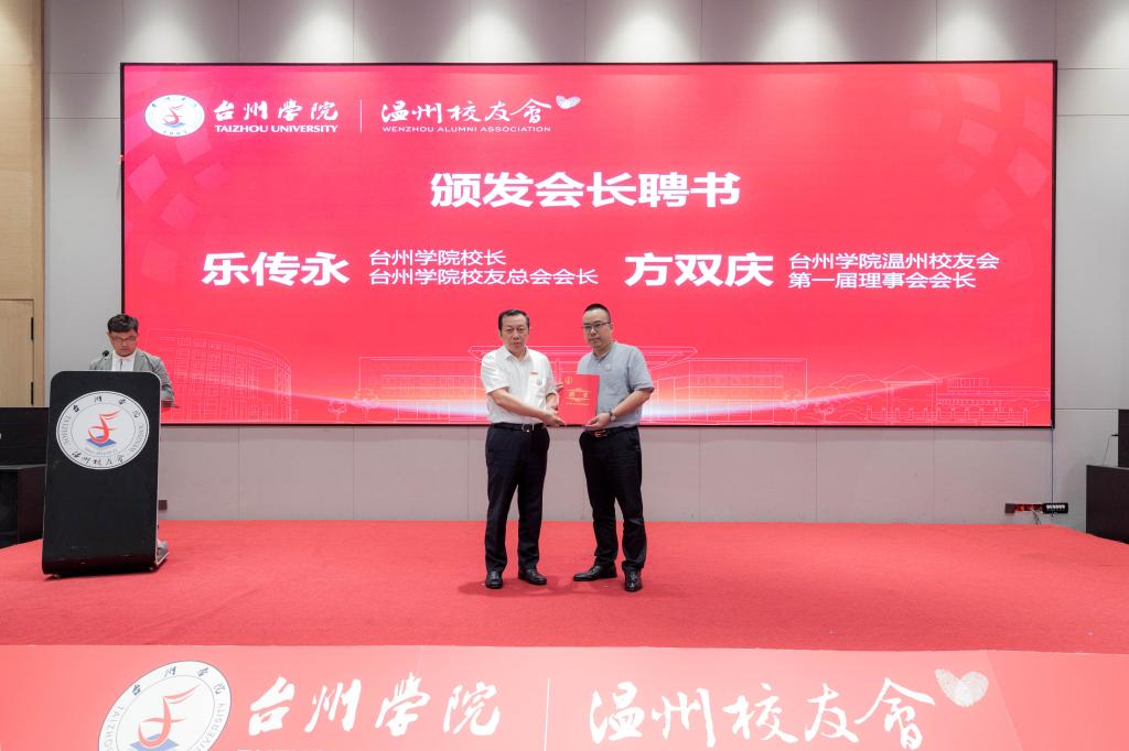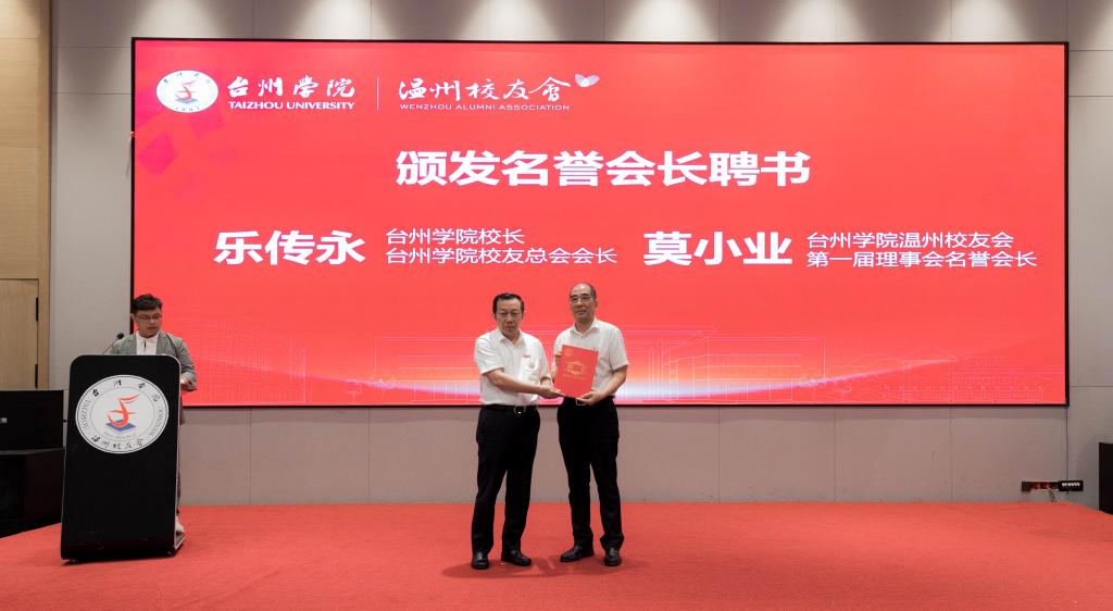 Yue Chuanyong presented appointment letters to Mo Xiaoye, Honorary President of the First Council of the Wenzhou Alumni Association of TU and President of the Taizhou Chamber of Commerce at Wenzhou, and Fang Shuangqing, President of the First Council of the Wenzhou Alumni Association of TU, Chairman of the Red Tomato Education Group, and an alumnus of the 2007 graduation.