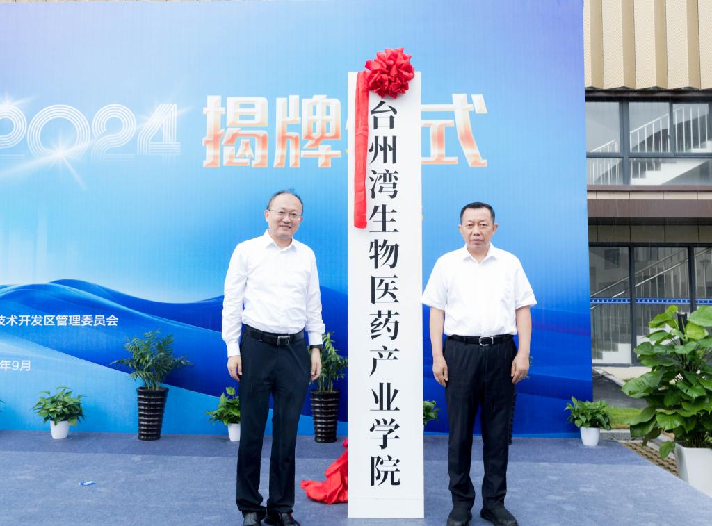 Miao Wenbin and Yue Chuanyong jointly unveil the plaque for Taizhou Bay Biopharmaceutical Industrial College