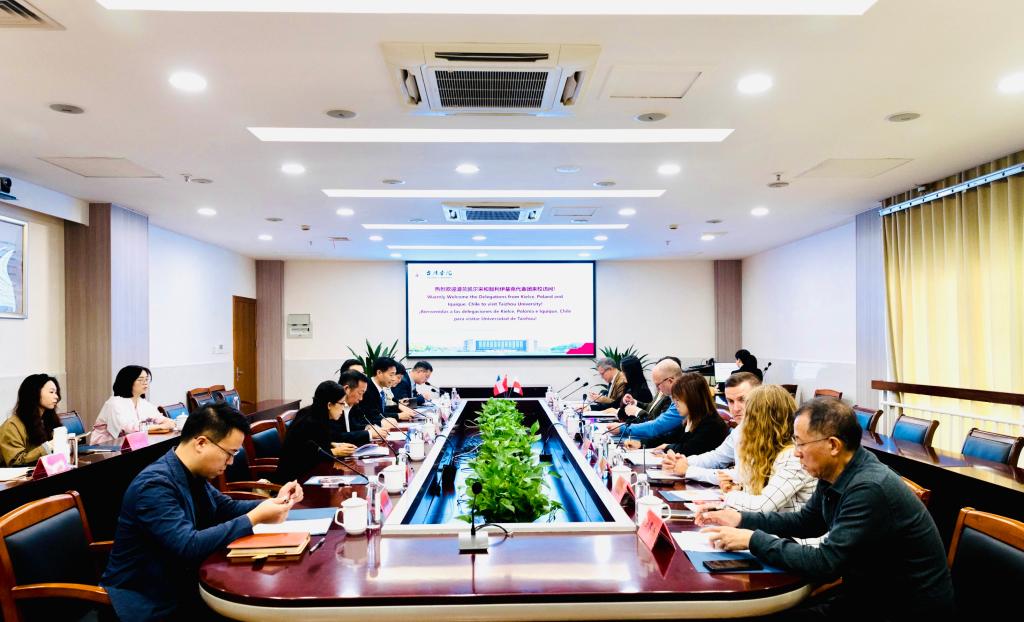 Bartlomiej Zapala, Deputy Mayor of Kielce, Poland, Martinez Quezada Alberto Alejandro, President of Arturo Prat University of Chile, and Valentin Humberto Volta Valencia, Executive Vice President of University of Alba, Antofagasta Campus of Chile, accompanied by Mr. Liu Wenhui, Secretary of the CPC Committee of Foreign Affairs Office of Taizhou Municipal People’s Government, visited TU on November 4. Yue Chuanyong, President of TU and Deputy Secretary of the CPC TU Committee, met with the delegations from Kielce and Iquique. The meeting was presided over by Li Jianjun, Vice President and Member of the CPC TU Committee.