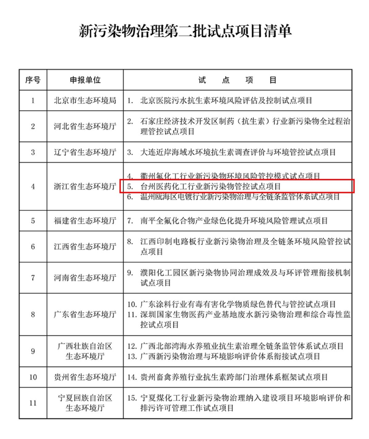 According to the “Notice on Printing the List of the Second Batch of Pilot Projects for New Pollutants Control” announced recently by the Ministry of Ecology and Environment of PRC, the “Taizhou Pharmaceutical and Chemical Industry New Pollutants Control Pilot Project,” based on the preliminary work of Professor Yu Binbin and Professor Yao Jun’s team, was successfully selected as one of the national pilot projects.