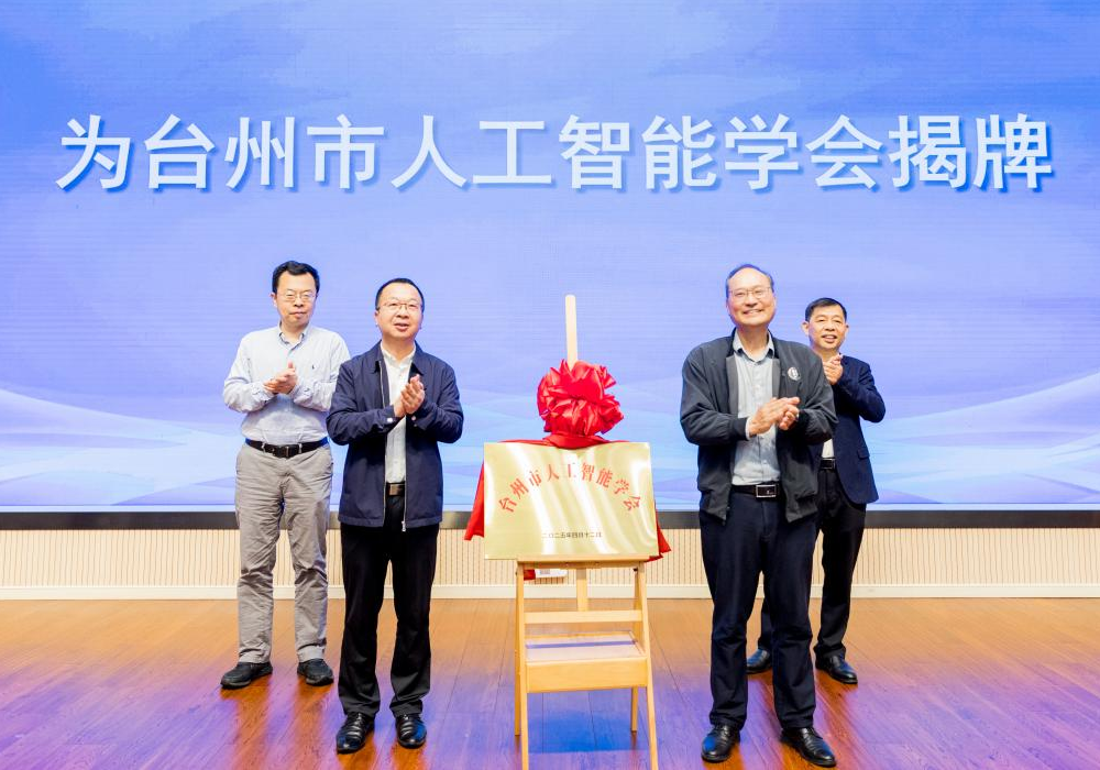 Han Deman and Yu Hongbiao unveiled the plaque for the Taizhou Artificial Intelligence Society. Chen Youzeng and Xu Changsheng, a researcher from the Institute of Automation of the Chinese Academy of Sciences, jointly witnessed the unveiling.