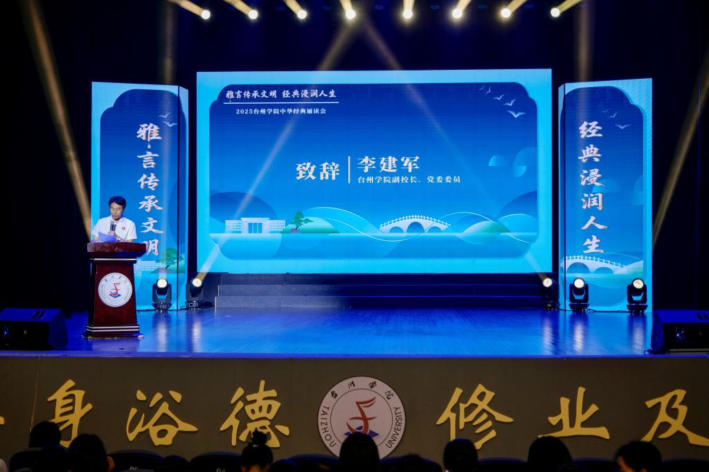 2025 Taizhou University Chinese Classics Recitation event titled “Elegant Language Inherits Civilization, Classics Moisten Life” was held on September 27 at the Linhai Campus Auditorium. Vice President and Party Committee Member Li Jianjun, Party Committee Member and Director of the Publicity Department Cai Haijiang, heads of relevant functional departments, and leaders, teachers, and students from secondary schools and colleges participated in this event.