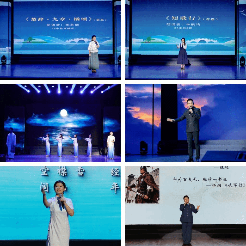 The first chapter, “Eternal Classics,” featured award-winning contestants from the provincial Chinese Classics Recitation Competition. Their performances spanned a wide range, from the vast philosophy of Zhuangzi · Autumn Waters to the poignant emotions of Congratulations to the Groom. Students Li Yantong and Yang Wei then painted an ethereal soundscape with Spring River Flower Moon Night, while Teacher Li Jianbing’s powerful rendition of Dreaming of Roaming the Mount Skyland: A Leave-taking Song vividly captured the transcendent spirit of poet Li Bai.
