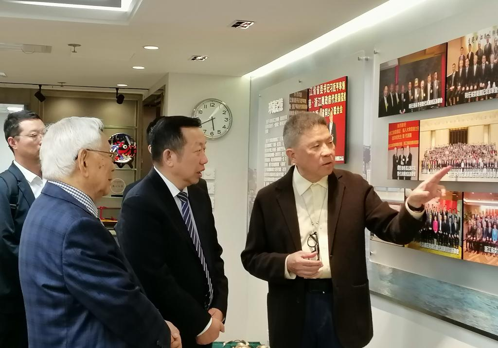 The delegation exchanging views with Mr. Zhan Hongliang, President of the Hong Kong Zhejiang Fellow Association Federation