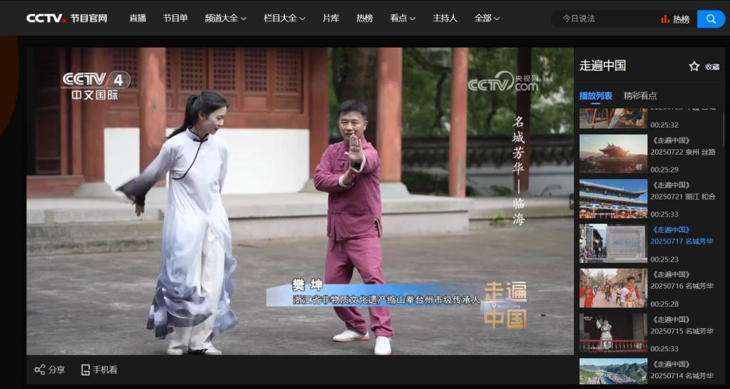 CCTV’s “Travel Across China” episode “Famous City’s Brilliance—Linhai” was broadcast on the evening of July 17th. Fan Kun, Associate Professor from the School of Teacher Education (Physical Education) at Taizhou University, and his Suoshan Martial Art Team were invited to participate.