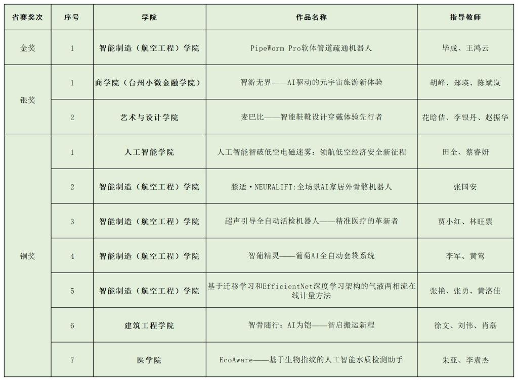 Taizhou University students won 1 Gold Award, 2 Silver Awards, and 7 Bronze Awards in the “AI+” Special Competition of the 19th “Challenge Cup” Zhejiang Provincial College Students’ Extracurricular Academic Science and Technology Works Contest held this summer. The project “PipeWorm Pro Soft Pipe Dredging Robot” by 8 TU students, guided by teachers Bi Cheng and Wang Hongyun from School of Intelligent Manufacturing (Aeronautical Engineering), won the Gold Award. This marks the university’s first provincial-level gold award in this competition. This breakthrough is not only the recognition for the work of the winning team’s teachers and students but also a strong reflection of TU’s innovation and entrepreneurship education level and student cultivation quality.