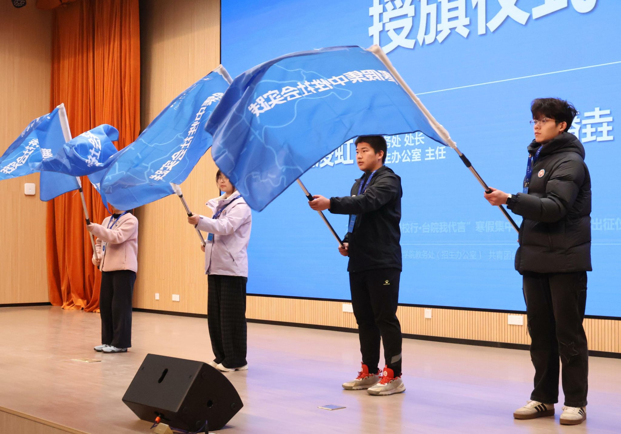 Jin Linghong, Director of the Academic Affairs Office and Admissions Office, and Pan Yao, Secretary of the University Youth League Committee, jointly presented activity badges and work IDs to the student representatives of the 2026 winter vacation social practice, and awarded flags to each practice team.