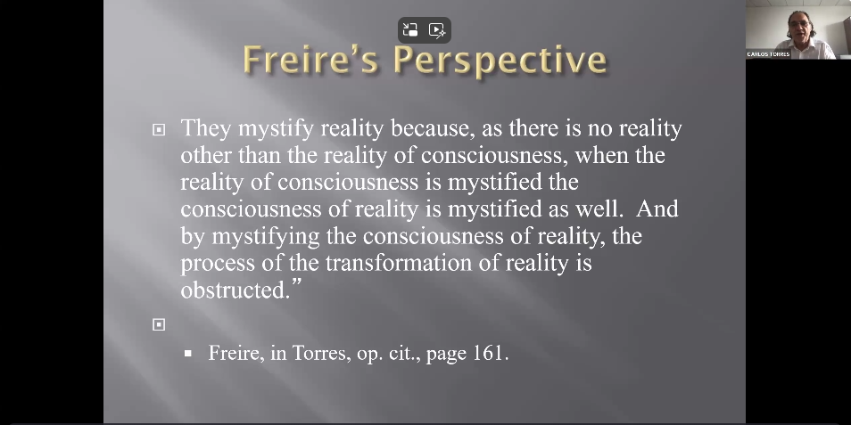 The seminar began with a keynote speech by Professor Carlos Torres, who introduced Paulo Freire’s educational thought and the historical context of his educational research and practice. Professor Torres emphasized that Freire’s perspective requires demystifying reality and deconstructing frameworks of oppression, domination, violence, and exploitation through “critical questioning”. This necessitates a shift from “cramming” education to “liberated” education, where dialogue inspires students to pursue liberation as active subjects. Professor Torres further delved into Freire’s ideas from epistemological and methodological perspectives, highlighting that education should transcend value neutrality to pursue an utopian ideal, deconstructing and criticizing oppressive structures from humanitarian, social historical, and sociocultural viewpoints.