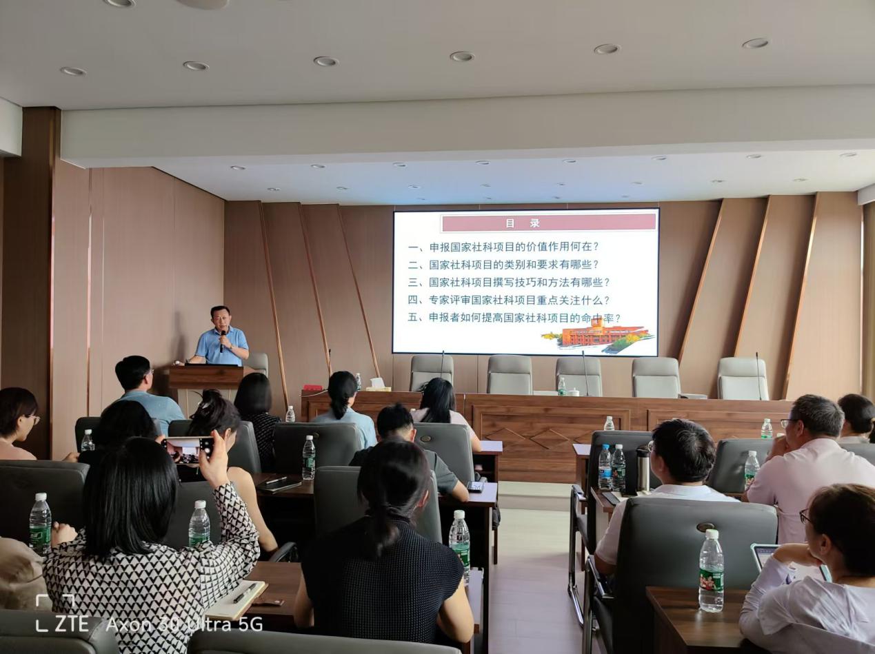 Le Chuanyong, President and Deputy Secretary of the CPC TU Committee, gave a lecture entitled “Topic Selecting and Writing Skills for National Social Science Projects” at the invitation of the School of Teacher Education (Physical Education) in the afternoon of September 2. Zhang Fuwei, Dean of the School of Teacher Education (Physical Education), presided over the event. Teachers at the School listened to the lecture.