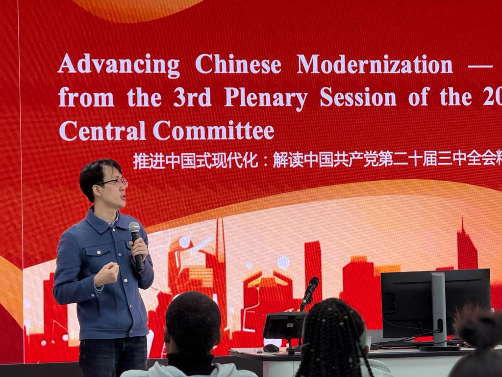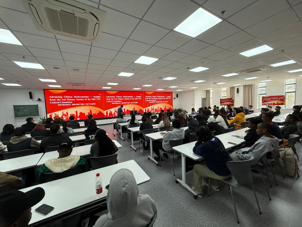 On November 28, Zhao Xuan, a teacher from TU’s School of Marxism, shared with international students the topic “Promoting Chinese path to modernization: Understanding the spirit of the 3rd Plenary Session of the 20th CPC Central Committee.” Ma Junzhou, Vice Director of the International Exchange and Cooperation Department, school counselors, and over 140 international students were present to listen.