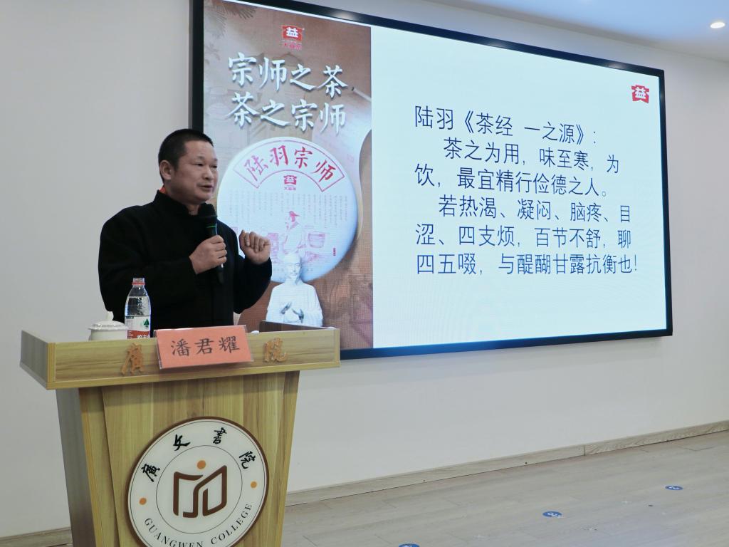 The lecture, which directly met the mainstream of tea culture, was welcomed by students. The multi-function hall of Guangwen Academy on Linhai Campus was full of students. With three pictures and three realms, Pan shared his life experience after his graduation from Taizhou Normal College (now TU) in 1993. He told stories about his psychological transformation from the field of education to journalism, and thereafter to tea. Based on the theme, he pointed out that with the global recognition of Chinese tea as an “intangible cultural heritage,” it is imperative for students to deepen their understanding of “Chinese tea.”