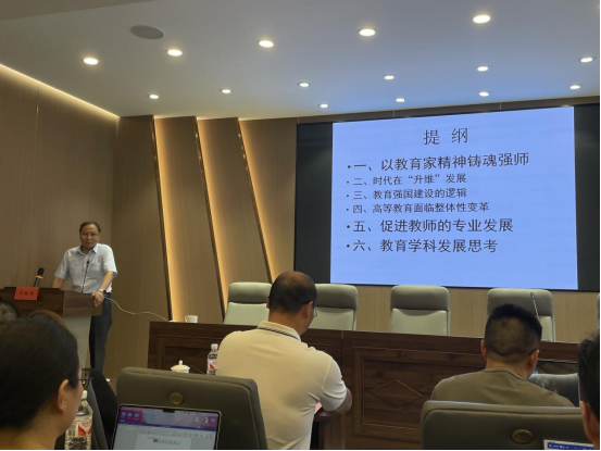 On the afternoon of September 9th, Professor Ma Luting from Chinese National Academy of Educational Sciences, at the invitation of the Development and Planning Department, delivered an academic lecture titled “Promoting the Spirit of Educators to Foster Teachers’ Professional Development”. The lecture was held at the School of Teacher Education (Physical Education), hosted by Lin Huijie, Party Committee Secretary of the school. Heads of relevant university departments and leading body of the school, as well as key faculty members attended.