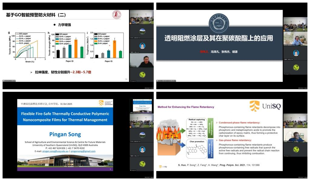 Professor Yu Bin (University of Science and Technology of China) reported on high-performance, multifunctional flame-retardant nanocoatings based on 2D nanomaterials, addressing issues like poor water resistance and mechanical/thermal performance in traditional coatings, and demonstrating early fire warning capabilities. Associate Professor Xing Weiyi (USTC) discussed molecular design of flame retardants and transparent coating preparation to combat scratching and dripping in polycarbonate sheets. Professor Song Ping’an (University of Southern Queensland, Australia) systematically presented flame-retardant, thermally conductive PVA-based and flexible PU-based nanocomposite films and their applications in AI chips, autonomous vehicle interfaces, and 5G base stations. Dr. Huo Siqi (USQ) reported on recyclable epoxy resins using synergistic flame-retardant components/dynamic covalent bonds, and the design/preparation of recyclable bio-based intrinsic flame-retardant epoxy resins. Finally, Professor Huang Guobo, Dean of the School, presented on preparing and applying graphene-based flame-retardant nanocomposites, detailing flame-retardant modified graphene and its polymer composites.