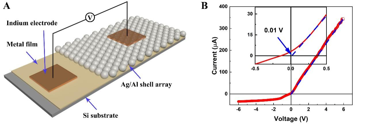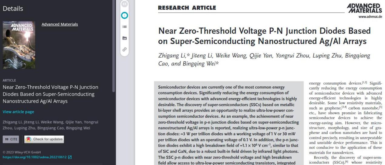 Semiconductor devices are one of the most common energy-consuming devices in everyday life. Power consumption is one of the key bottlenecks limiting the performance improvement of semiconductor chips. Compared with conventional semiconductors, metals usually consume less power at the same current. However, it is more difficult to produce functional devices based entirely on metals, such as p-n junction diodes, transistors and chips because of the large number of free electrons in metals. In recent years, Prof. Li Zhigang’s team, in close collaboration with Prof. Wei Bingqing from the University of Delaware, have discovered for the first time that metallic bi-layer shell arrays exhibit semiconductor transport behavior with ultra-low resistivity and successfully constructed p-n junction diodes with pure metal nanoarrays. The team constructed the Ag/Al bimetallic shell structure (where Ag is the plasmon resonance layer and Al is the electron transport layer) by magnetron sputtering through colloidal crystal template etching. At the same time, an Ag film is deposited on the substrate to prevent the formation of Schottky contacts between the shell array and the silicon substrate. Compared with the conventional semiconductor p-n junction, the metal plasmon resonance-based p-n junction has two major advantages: ① Ultra-low power consumption. The achievement of near zero-threshold voltage in p-n junction diodes based on super-semiconducting nanostructured Ag/Al arrays is reported, realizing ultra-low-power p-n junction diodes: ≈3 W per trillion diodes with a working voltage of 1 V or 30 mW per trillion diodes with an operating voltage of 0.1 V. ② High breakdown field. Due to a robust built-in field driven by infrared light photons, the p-n junction diodes exhibit a high breakdown field of ≈1.1 × 106 V cm−1, similar to that of SiC and GaN. (links for more information: https://onlinelibrary.wiley.com/doi/10.1002/adma.202210612)