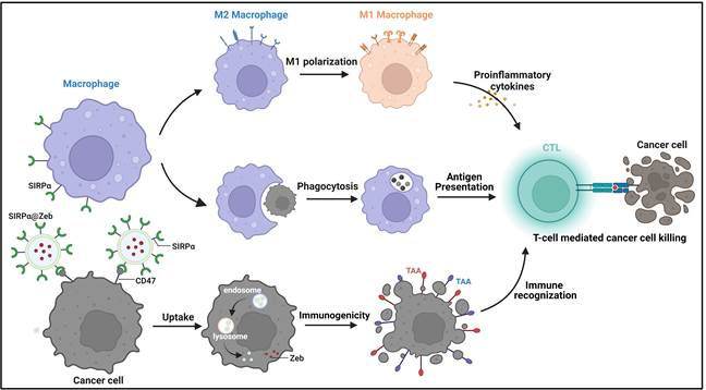 In this resaerch, we designed and prepared a cell membrane nanovesicle expressing SIRPα receptor to specifically block the CD47-SIRPα signaling axis, promote macrophage phagocytosis, promote M2-type macrophages to M1 polarization, and activate anti-tumor immune response. In addition, considering that tumors evade immunosurveillance through low (or no) expression of tumor-associated antigen (TAA), this study utilized SIRPα cell membrane vesicle endosomes loaded with Zebularine (Zeb), a DNA methylation enzyme inhibitor, to enhance melanoma-specific antigens (CD146 and TRP1) through Zeb. (Zeb enhances the expression of melanoma-specific antigens (CD146 and TRP1) and promotes tumor recognition by the immune system; uses the SIRPα receptor on the cell membrane vesicles to bind to the CD47 ligand of tumor cells, blocking the "don't eat me" signal between tumor cells and macrophages and promoting the processing of tumor antigens The study was conducted to improve cancer therapeutic efficacy through the release of pro-inflammatory factors from polarized M1-type macrophages and the activation of the body's anti-tumor immune response in multiple ways. This study provides important data to support the development of phagocytic checkpoint-based ICIs.