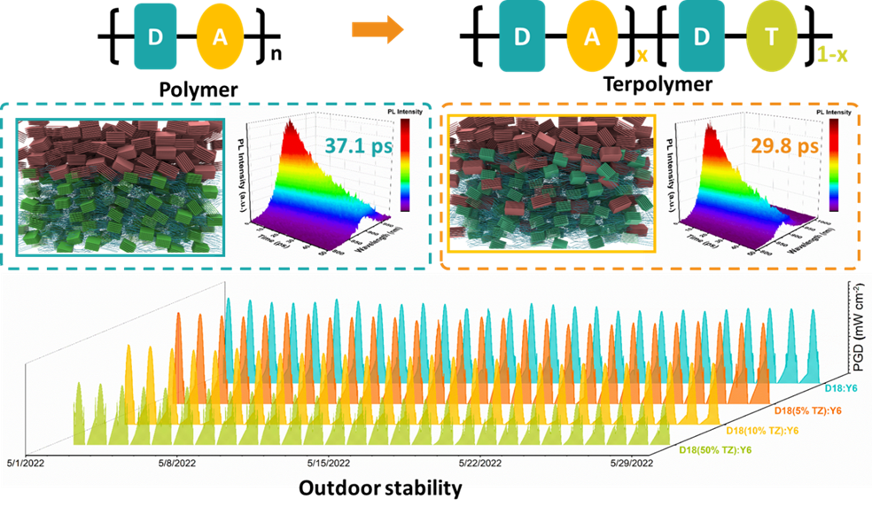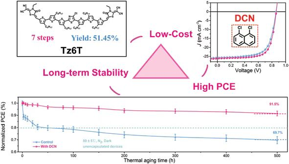 Printable organic solar cells resemble a piece of plastic film that can generate electricity, with the advantages of lightness, thinness, flexibility, and good low-light performance. The research team focused on this area and achieved the following breakthroughs: 1) designed and developed a high-performance ternary polymer outdoor organic solar cell with cell efficiency up to 18%, and can continue to maintain 96% of the initial efficiency after 32 days of exposure to air; 2) developed a new solid additive, which can significantly improve the quality of active layer morphology, and successfully increased the efficiency of oligothiophene-based organic solar cells to 16%, setting a new world record for related cell efficiency, and certified by a third-party authoritative structure.
