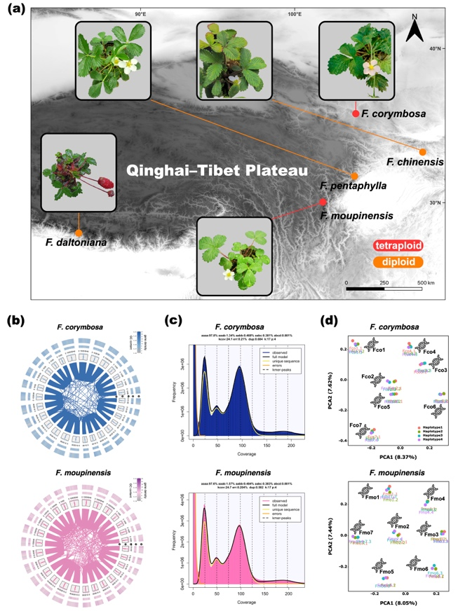 The evolutionary patterns of niches and genetic backgrounds between polyploid plants and their diploid ancestors have been a long-term focus of the ecological field. This paper took Fragaria plants of the Rosaceae family as the research subject, assembled the chromosome-level whole genomes of five wild strawberry species including F. corymbosa, and focused on two unique tetraploid species in China, namely F. corymbosa and F. moupinensis, for related research. The whole genome data showed that the diploid Chinese strawberry is the most likely ancestor of the tetraploid F. corymbosa, while the ancestors of the tetraploid F. moupinensis might be unsampled Chinese strawberry populations or extinct related species. At the same time, there is extensive gene introgression among diploid strawberry species. Combining transcriptomic data, the study found that compared to their diploid ancestors, the tetraploid species show gene family expansion and increased transcription levels in genes related to UV radiation and DNA repair, while they exhibit gene family contraction and decreased transcription levels in genes related to various stress responses, providing important molecular genetics insights into this hot issue.
