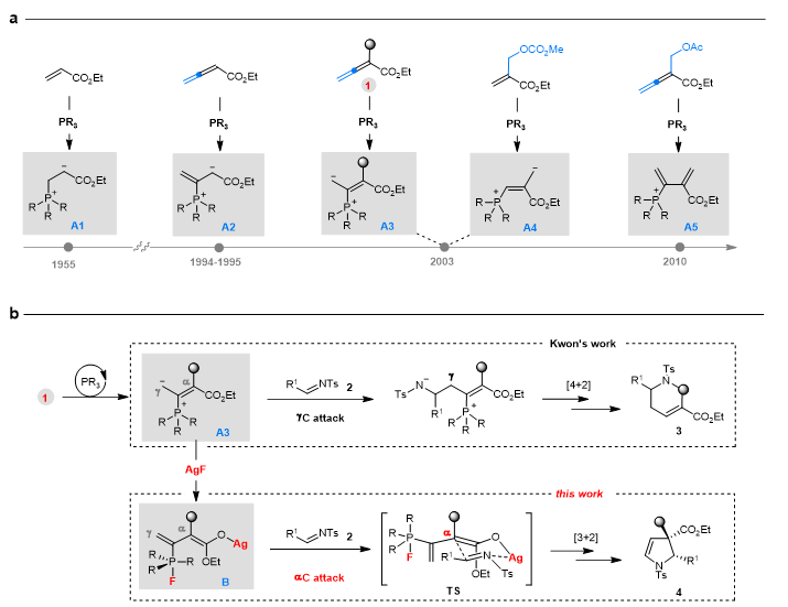 In the nearly 70-year history of research on tertiary phosphine catalysis, the core development strategy has been to use differently structured electrophilic reagents to form unique reactive dipolar ions A1-A5 (Figure-1a). In this study, the group took an innovative approach by using AgF additives to modify these traditional dipolar ion intermediates, thereby obtaining new reactivity. The specific research approach is shown in Figure 1b.