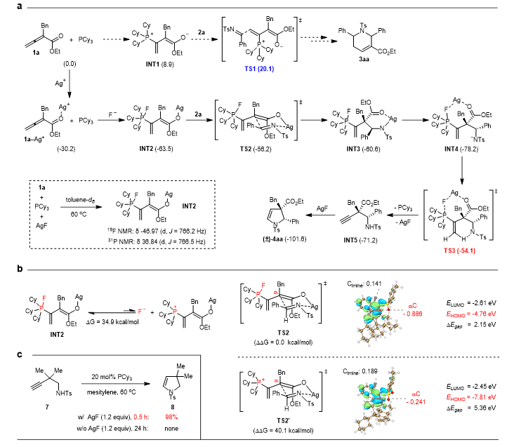 The study on the reaction mechanism showed that the power of the AgF additive mainly comes from the strong affinity between Ag+ and the oxygen anion, as well as between F- and the phosphonium cation, which efficiently converts the dipolar ion intermediate A3 into the fluoro-phosphane-enol silver intermediate INT2 (see Figure 2a). Ag+ can further exert its Lewis acidic nature to promote the Mannich reaction of the imine from the original γ position to the α position. Additionally, the fluoro-phosphane structure also favors enhancing the nucleophilicity of the intermediate INT2 (see Figure 2b). AgF also acts as a catalyst for the hydroamination of alkyne, allowing the final cyclization process to be completed smoothly (see Figure 2c).