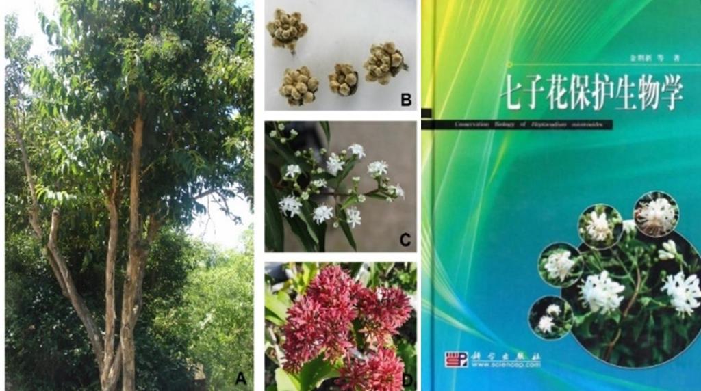 Heptacodium miconioides is a deciduous small tree in the family Caprifoliaceae and is a unique monotypic genus native to China. The plant has terminal paniculate inflorescences that are nearly pyramidal, composed of multiple rounds of dense, head-like cymes, each containing a pair of cymes with 3 flowers and a terminal single flower (“top flower”), totaling 7 flowers (see Figure 2), from which the name “Heptacodium” is derived. Due to its unique morphological characteristics, Heptacodium miconioides is widely regarded as an excellent ornamental plant. Its natural distribution area is relatively narrow, scattered only in Zhejiang, Anhui, and Hubei provinces. Heptacodium miconioides has been listed as one of the first batch of national second-class key protected wild plants and has been included in the “China Red Book of Plants—Rare and Endangered Plants (Volume 1)”, “China Species Red List” (endangered species), “China Red List of Biodiversity” (endangered species), key endangered species in the key groups of Chinese angiosperms, priority protected species in the China Biodiversity Conservation Action Plan, and the IUCN Red List of Endangered Species. Professor Jin Zexin’s team has long been engaged in the conservation biology research of Heptacodium miconioides and is considered the authoritative scholar on this plant in China. Professor Jin’s team has made significant breakthroughs in the research on population structure, community species diversity and abundance distribution, endangered mechanisms, and conservation strategies of Heptacodium miconioides (In Figure 2 “Conservation Biology of Heptacodium Miconioides” is a book compiled by Professor Jin Zexin and Professor Li Junmin, published by Science Press).