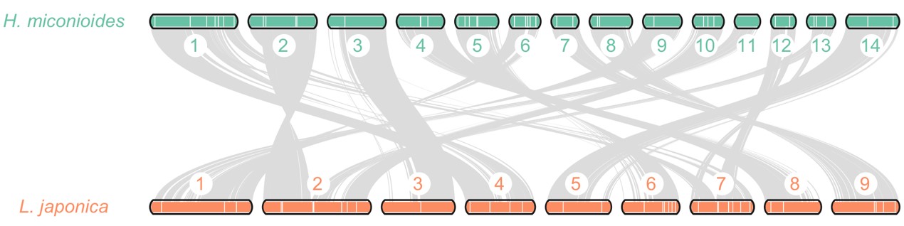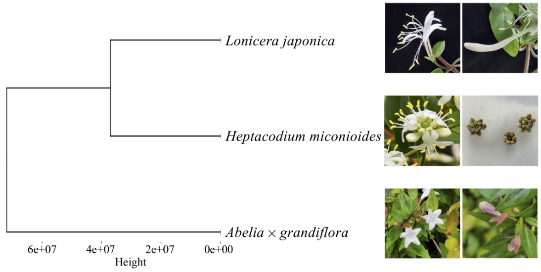 However, for over a century since its first report by Rehder in 1916, botanists have been troubled by the inability to reconcile its unique morphological characteristics with molecular biological results, making it difficult to determine its systematic position. The inflorescence of this genus is similar to the disc-leaf group of the genus Lonicera, while its ovary and fruit structure resemble those of the genus Abelia, indicating that it is a group between the tribes Caprifolieae and Linnaeeae. Some scholars emphasized classic morphological characteristics and suggested placing Heptacodium in the tribe Linnaeeae, while others emphasized modern molecular biological evidence and tended to classify it within the tribe Caprifolieae. Accurate classification of a species’ systematic position is a prerequisite for effective protection and scientific utilization of the species, and the taxonomic disputes over the genus Heptacodium have severely hindered its conservation and further rational development and utilization. Recently, Professor Hu Jinfeng’s team, in collaboration with Professor Jin Zexin’s team, has published a research paper titled “Major specialized natural products from the endangered plant Heptacodium miconioides, potential medicinal uses and insights into its longstanding unresolved systematic classification” in the authoritative SCI journal Phytochemistry, providing new evidence from the perspective of chemical taxonomy for the systematic position of Heptacodium miconioides in the family Caprifoliaceae. The paper systematically studied the chemical components of Heptacodium miconioides and discovered multiple new compounds. A chemical taxonomic analysis was conducted: the HPLC fingerprint profiles of the flower buds were compared with those of two other abundant Caprifoliaceae plants, namely Lonicera japonica (honeysuckle) and Abelia grandiflora, and a hierarchical cluster analysis was performed (see Figure 3). The results showed that the relationship between the seven-seed flower and honeysuckle was closer, and it should be classified under the honeysuckle subfamily. This result was further confirmed by collinear analysis of secondary metabolite biosynthesis pathway genes in honeysuckle and heptagonium plants (see Figure 4).