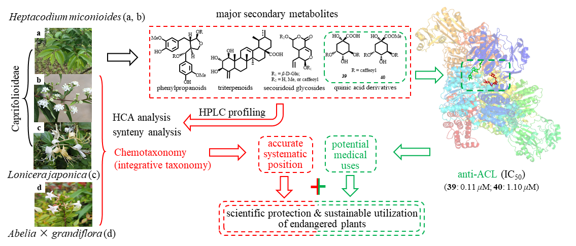 ACL is a key enzyme in glycometabolism and the biosynthesis of fatty acids and cholesterol, with its substrates and products being critical intermediates in sugar metabolism, while also serving as substrates for fatty acid synthesis. Efficient ACL inhibitors can block the biosynthesis of fatty acids and cholesterol at the source and reduce blood lipids, showing promising prospects for the prevention or treatment of diseases related to dyslipidemia and glucose metabolism disorders (GLMDs). For this target, only one small-molecule drug (bempedoic acid, Nexletol) was approved by the U.S. FDA and the European Medicines Agency in 2020 for the treatment of hypercholesterolemia, marking the first oral non-statin lipid-lowering medication. In 2022, the global market for bempedoic acid was approximately 50 million USD, with an estimated value of 214 million USD by 2029. In fact, during the research and development of small-molecule chemical drugs, the specific chemical structure of the drug molecules plays a crucial role, hence there is an urgent need for structurally novel and diverse small-molecule ligands as potential lead compounds for new GLMDs target inhibitors. It is widely known that natural products have always been an important source for discovering innovative drugs with novel structures and new mechanisms of action. Discovering innovative drug lead compounds against GLMDs from natural products (especially from the unique medicinal resource of rare and endangered plants with relatively high potential for drug development) has significant research value. Natural compounds with unique sources, novel structures, and unique mechanisms of action are expected to gain a place or win in the fierce competition in the research and development of innovative drugs for the prevention and treatment of GLMDs.