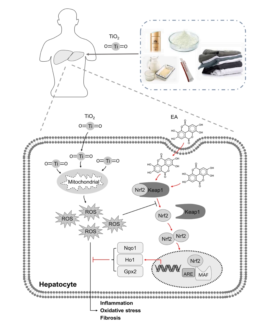 Titanium dioxide nanoparticles (TiO2 NPs) have raised safety concerns due to their widespread applications. This study indicated that TiO2 NPs may cause liver injury, primarily by triggering oxidative stress and inflammatory responses. Ellagic acid (EA), a dietary polyphenol extracted from natural sources, is known for its antioxidant and anti-inflammatory properties, but its role in alleviating TiO2 NPs-induced liver injury has remained unclear. This study demonstrated the protective effects of EA against such liver injury. EA significantly reduced cytotoxicity, oxidative stress, and inflammatory markers in hepatocytes, and treatment with EA markedly lowered serum transaminase levels in mouse experiments. Additionally, EA mitigated stress, inflammation, and fibrosis in the liver, showing effects comparable to the positive control drug, sulforaphane (SFN). Its mechanism primarily involves the nuclear translocation and phosphorylation of Nrf2. This study provides new insights into the potential application of EA as a natural Nrf2 activator in treating TiO2 NPs-induced liver injury. By activating the Nrf2 pathway, EA can effectively reduce liver injury and improve liver function, suggesting promising applications in liver disease treatment.