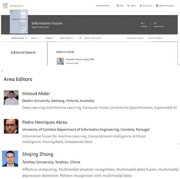 According to statistics from the editorial boards of Information Fusion and IEEE Transactions on Affective Computing, Professor Zhang Shiqing is currently the only representative from a local university in China, with the other domestic editors coming from well-known 985/211 universities. His appointment as an editor reflects his academic status and influence both domestically and internationally.