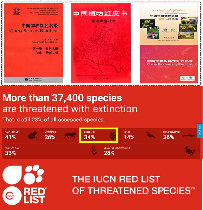 According to the IUCN Red List of Threatened Species, about 34% of global conifer species are at risk of extinction (Figure 1). Conifers, taxonomically, refer to all species in the class Coniferopsida of the gymnosperms, encompassing seven families: Pinaceae, Taxodiaceae, Cupressaceae, Podocarpaceae, Cephalotaxaceae, Taxaceae, and Araucariaceae. China is rich in conifer resources, with distributions in all families except Araucariaceae, totaling about 200 species. Some conifer species are relics preserved from the Tertiary Period of the Cenozoic Era after the Quaternary glaciation, many of which are endemic to China.