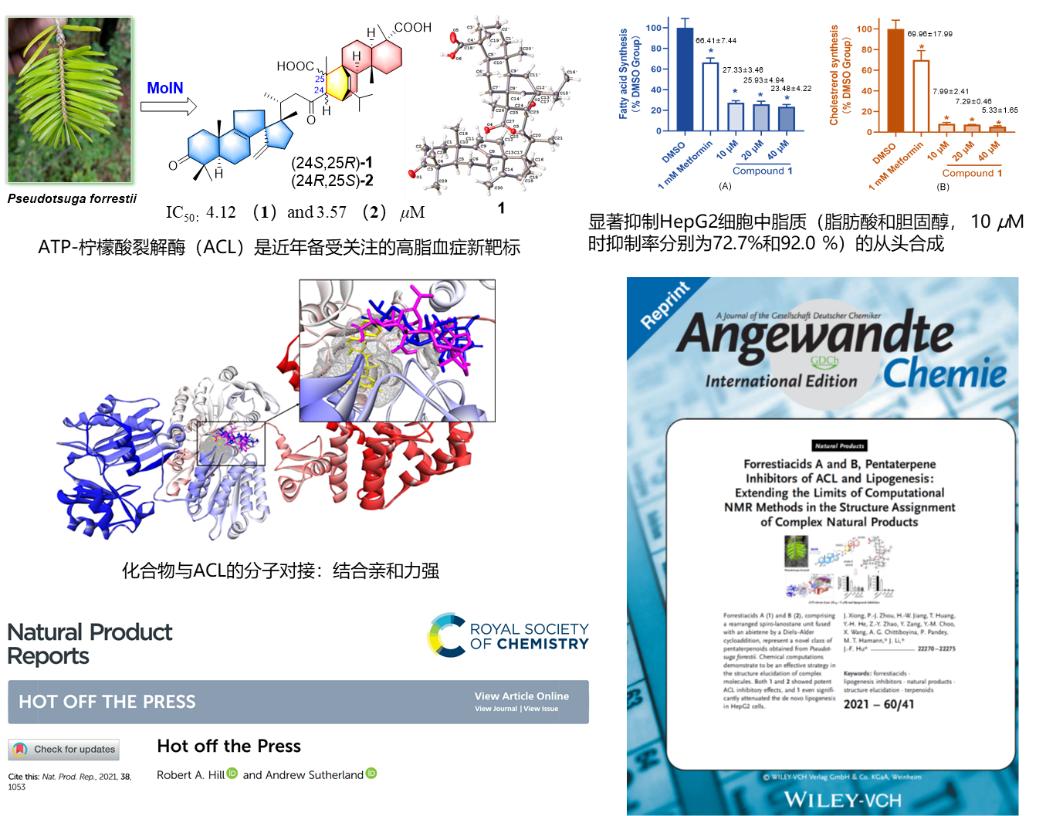 1. Completed research on the chemical constituents of REPs (rare and endangered plants) from 18 species of Chinese endemic pine and fir trees, including Abies georgei, resulting in the isolation and identification of a total of 557 structurally diverse compounds, including 175 new compounds and 24 new skeletal compounds belonging to 12 classes. Chemical derivatization was carried out for some novel skeletal compounds to establish a derivative library for structure-activity relationship studies. For example, using LC-MS-based targeted isolation technology (MoIN), a series of novel heterocyclic terpenes with unique skeletons and ACL (ATP-citrate lyase) inhibitory activity were isolated and identified from Pseudotsuga forrestii. Some of these findings were published in Angew Chem Int Ed, a top-tier academic journal in the field, and were highlighted by NPR as “Hot-off-Press” molecules (Figure 8).