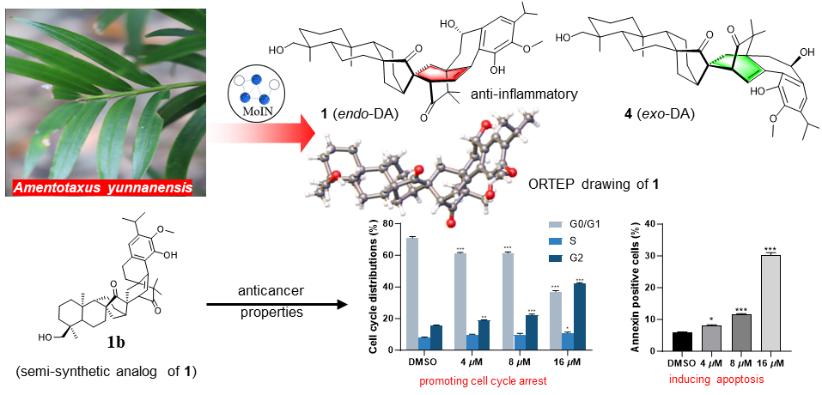 Since 2013, the applicant and the research team have been pioneers in China in studying the secondary metabolites (including trace components) with novel chemical structures and their biological functions from Chinese endemic REPs and their unique endophytes. Parts XX (https://spfdu.fudan.edu.cn/46/63/c28478a411235/page.htm), XXXII (https://www.tzc.edu.cn/old/info/1151/77717.htm), and XXXVII (https://www.tzc.edu.cn/info/1582/180773.htm) of this series of work have been reported on the official websites of the School of Pharmaceutical Sciences, TU, and the School of Pharmaceutical Sciences, Fudan University, as well as on the public platform “Wen Hai Shi Cui” (https://mp.weixin.qq.com/s/pZxxxCnq6QSubtNQvZDfjQ). This is Part XLIII of the “Phytochemical and biological studies on rare and endangered plants endemic to China” series, which has just been completed. It focuses on MoIN-guided exploration, chemical derivatization, and biological activity studies of complex 6/6/6/5/6/6/6/6 spirooctacyclic new skeletal diterpene dimers found in Amentotaxus yunnanensis, an endangered plant in China (Figure 10, see Org. Chem. Front. 2025, DOI: 10.1039/d4qo02210f).