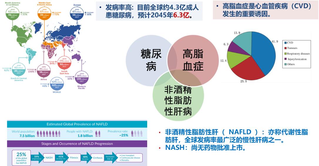 Major metabolic diseases, including type 2 diabetes, obesity, hyperlipidemia, hypertension, and nonalcoholic fatty liver disease, seriously affect human health. The occurrence of these diseases is closely related to abnormal regulation of glucose and lipid metabolism, with multiple diseases accompanying and synergizing in disease progression models (Figure 6). Currently, there are few drugs available for these diseases, and there is an urgent need to develop new drugs against major metabolic diseases.
