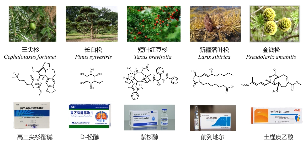 Figure 5. Star drug molecules discovered in rare and endangered conifer species (examples)